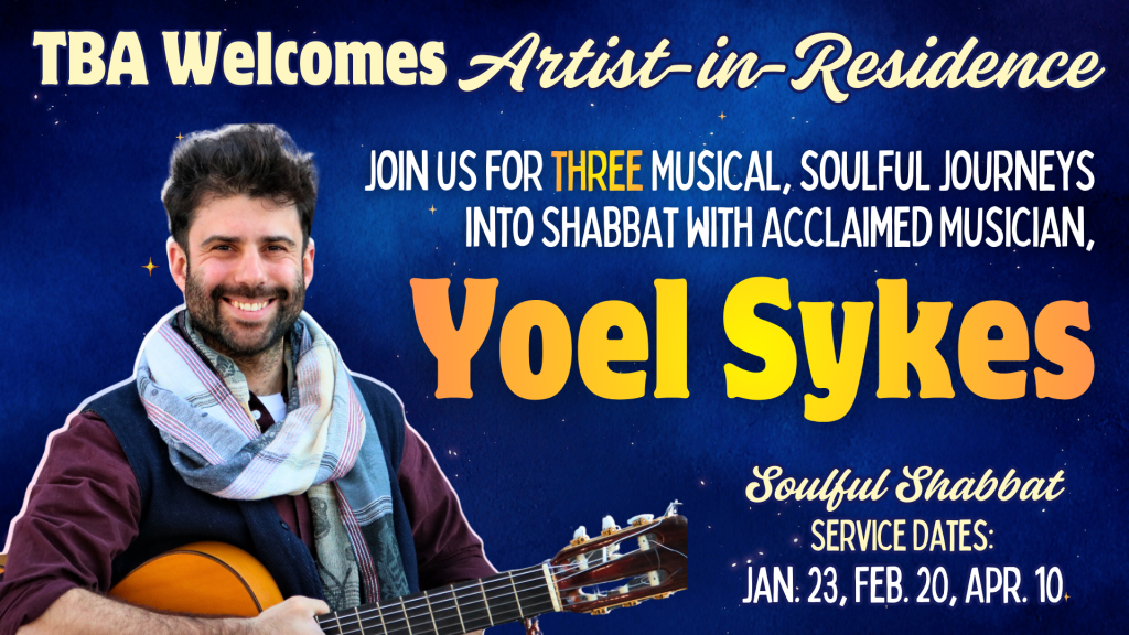 Join us for 3 soulful Friday night Shabbat services, led by artist-in-residence Yoel Sykes, who will be joined by our clergy and a small TBA vocal emsemble. Yoel’s soul-stirring melodies— including the beloved Oseh Shalom— have long nourished our TBA community. Experience Shabbat through sound, spirit, and song, as Yoel welcome us into prayer spaces infused with harmony, intention and deep communal connection.